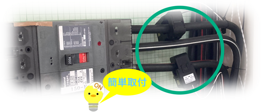 設備を止めることなくセンサー部分を計測したい装置の電源コードにカチッと挟むだけで取付け完了!