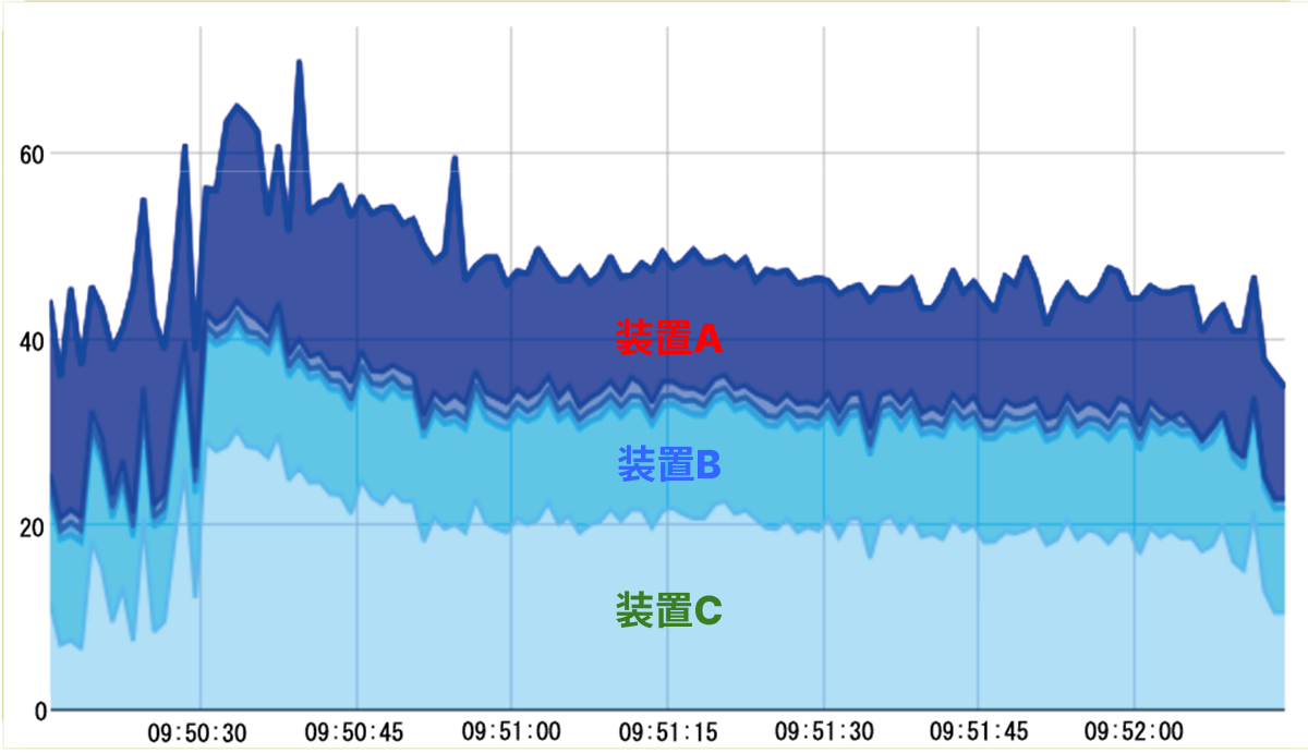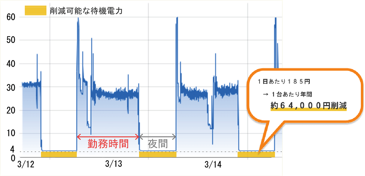 取得した設備の消費電力量のグラフを分析すると、夜間に消費電力が上がることが判明。